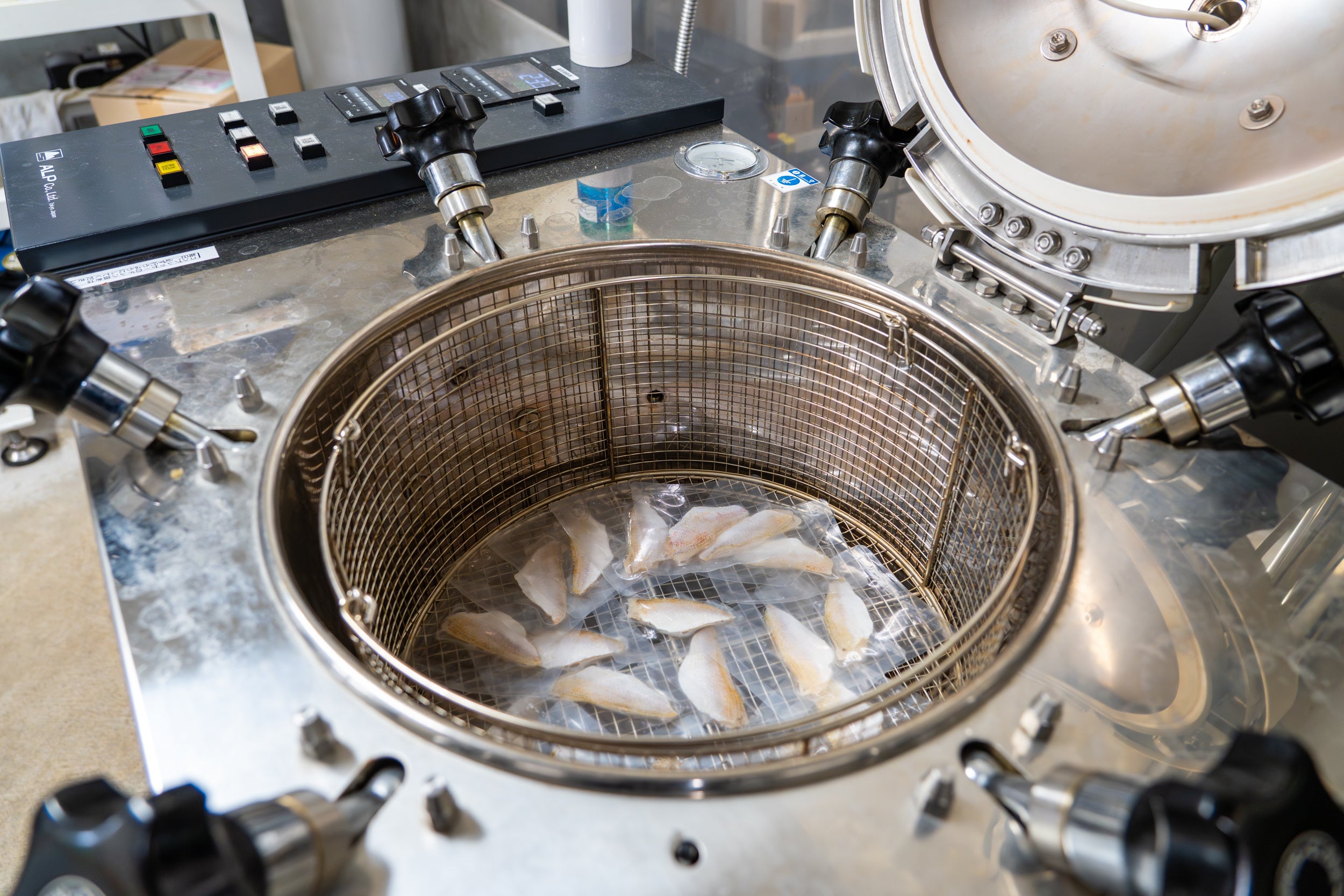 Process2. 乾燥専用の乾燥機に入れ、旨味を凝縮させるためにゆっくりと数時間ねかせます。最新の乾燥技術により、しっとりとジューシーな食感に仕上がります。