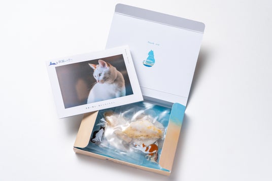 ■ ギフトとして、開ける瞬間から始まる「体験」を1枚ずつ丁寧に真空パックした食べきりサイズ(6パック入り)を、山陰・浜田の情景を描いたオリジナルの化粧箱に収めました 。洗練されたパッケージと商品紹介リーフレットは、封を開ける瞬間の喜びを演出し、愛猫への「いつもありがとう」の気持ちを形にします 。