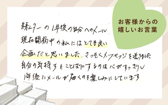 「現在、闘病中の私にはとても良い企画だと思いました。さっそくメッセージを送りました。自分の気持ちをことばにするのは心がすっきりし1年後にメールが届くのを楽しみにしています。」