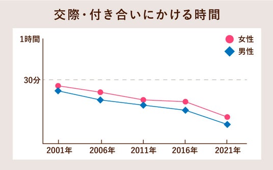 「男女、主な行動の種類別生活時間(2001 年~2021 年)-週全体の交際・付き合い」※参照元:総務省統計局「令和3年 社会生活基本調査」