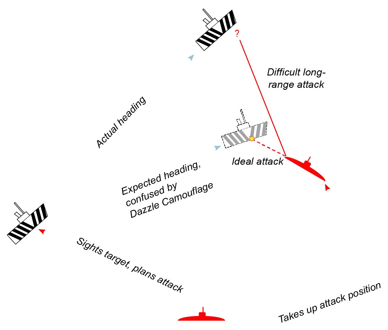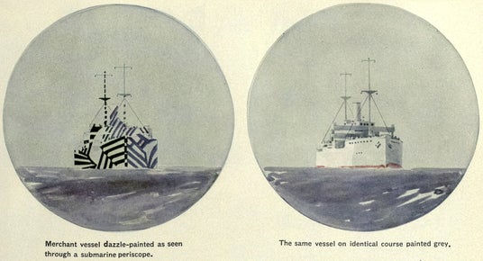 通常の迷彩が風景に溶け込んで存在を隠そうとするのに対し、ラズル・ダズル迷彩は逆に目立たせた上で敵を幻惑させようとする、実に異質なパターンだったのです。