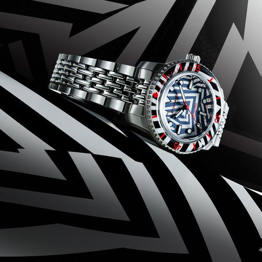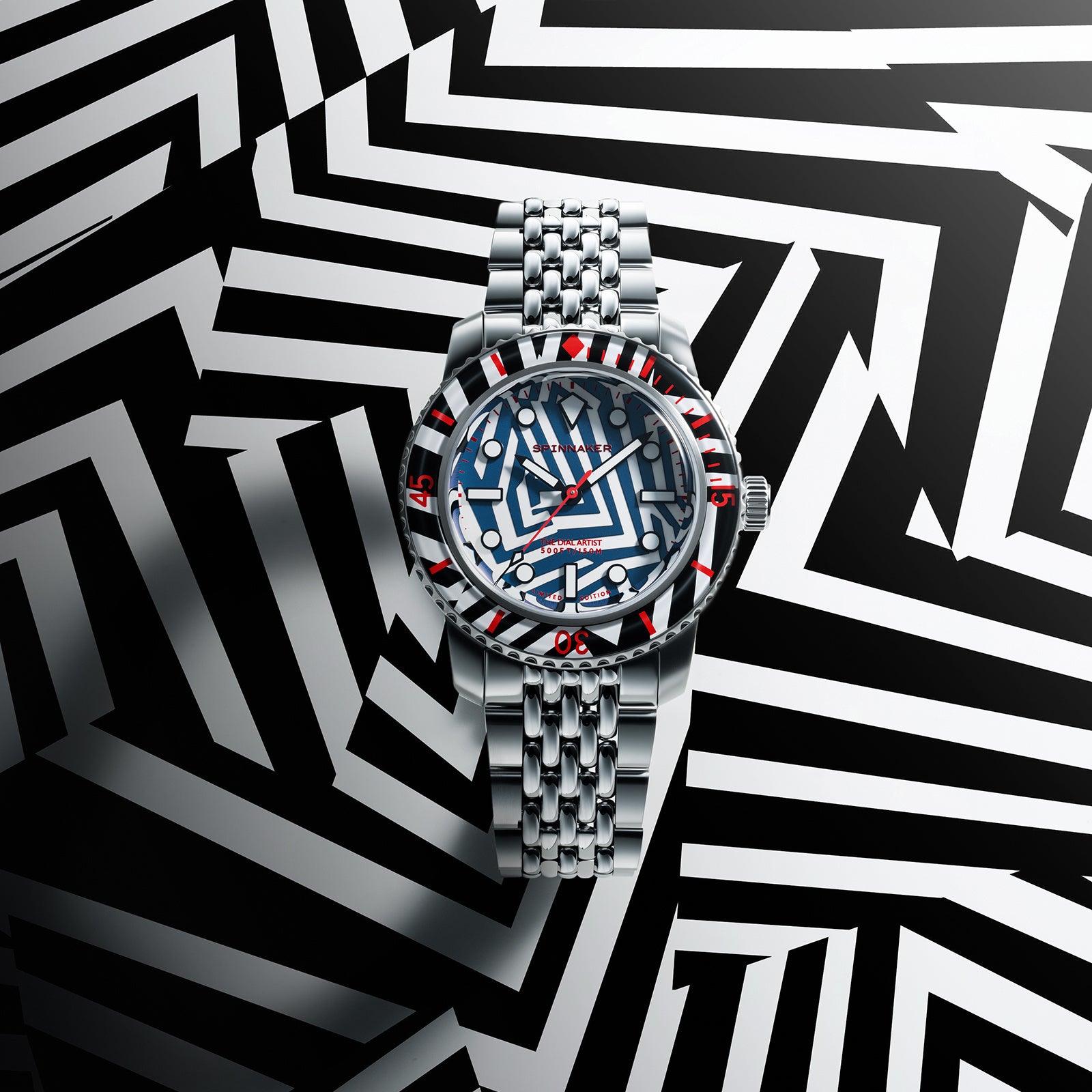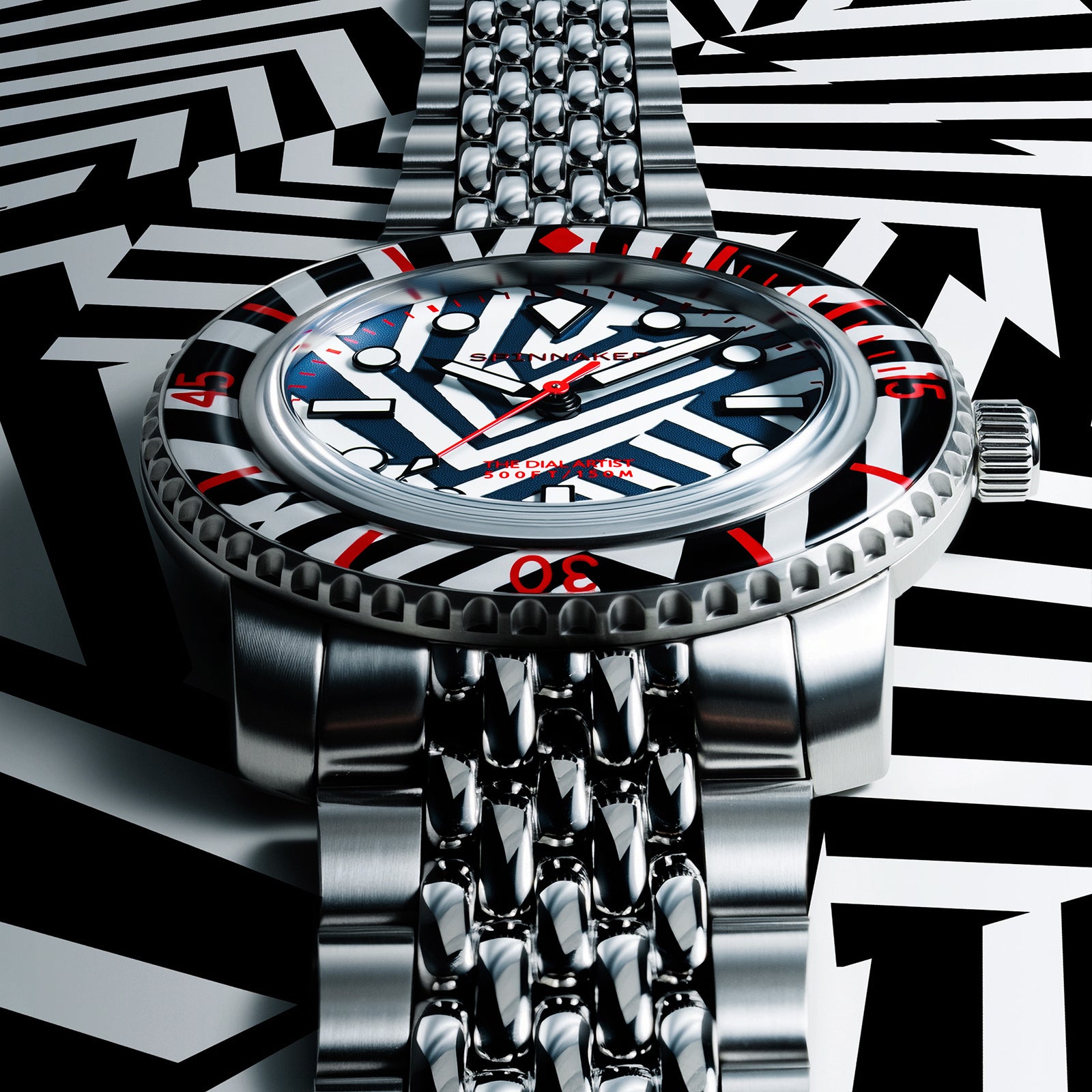 視線を落とすたび、“時間の輪郭”を見失うかもしれません。スピニカーのフルース 40 オートマティック ラズル・ダズル リミテッドエディションはかつてないほど前衛的でトリッキーなパターンにより、見る者を幻惑し、魅了します。英国人アーティストのクリス・アレクサンダーがデザインを手掛けた、500個の限定モデルです。