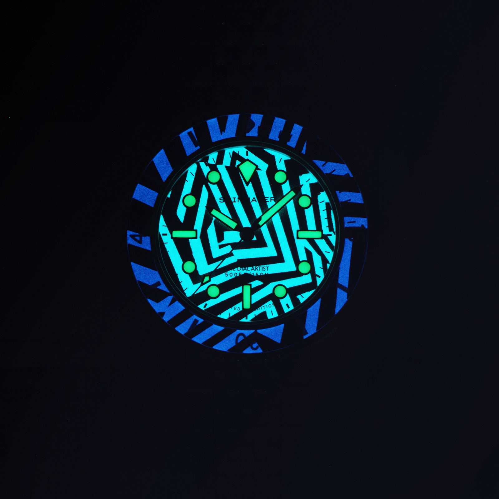シンプルなバトン針や、バーとドットを組み合わせたインデックスは、ラズル・ダズル迷彩の幾何学模様と高い親和性を持ち、見る者を幻惑。秒針やロゴ、ベゼルの目盛りに用いた鮮烈なレッドカラーは、強烈なインパクトを与えた上で迷彩効果を果たそうという、このパターンらしい配色です。6時位置には、デザイナーであるクリス・アレクサンダーの異名「THE DIAL ARTST」が刻印されています。