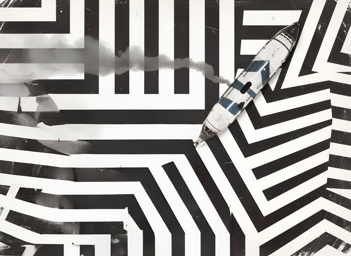 ラズル・ダズルは、主に第一次世界大戦時に船舶用迷彩として使われていました。ハイコントラストかつ幾何学的なストライプやブロックが施すことで、その対象の形状や進行方向、距離感を錯覚させ、敵の攻撃から逃れることを目的としていました。