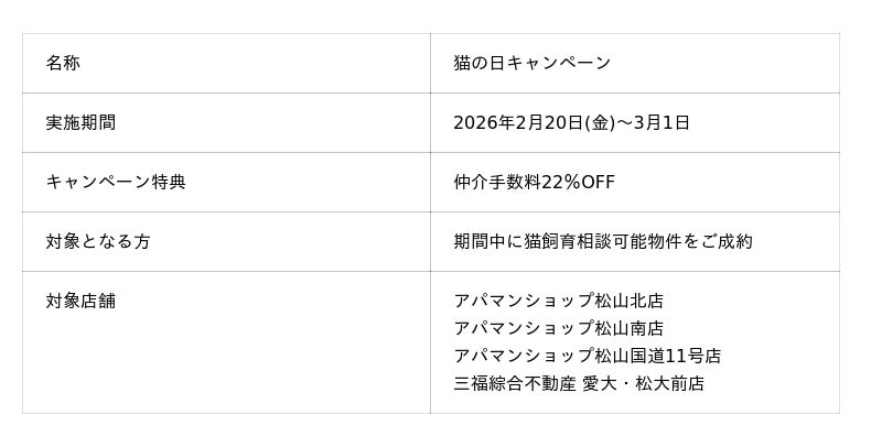 株式会社三福綜合不動産(本社:愛媛県松山市)は、2026年2月22日の「猫の日」に合わせ、猫と暮らせるペット可賃貸物件を対象とした初期費用サポートキャンペーンを開始いたします。