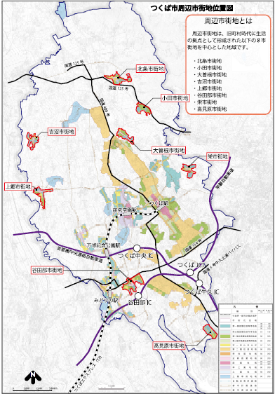 周辺市街地とは…周辺市街地は、合併前の旧町村時代に生活の拠点として発展してきた市街地(北条、小田、大曽根、吉沼、上郷、栄、谷田部、高見原)を中心とした地域を指します。