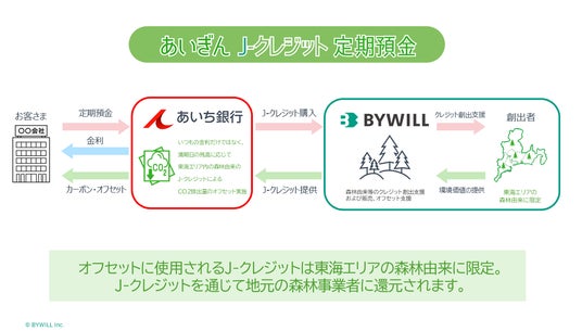 「GXをやりたくなる世界」を目指し、環境価値を活用した経済循環を推進する株式会社バイウィル(本社:東京都中央区、代表取締役社長:下村 雄一郎、以下「バイウィル」)は、株式会社あいち銀行(本店:愛知県名古屋市、代表取締役頭取執行役員:鈴木 武裕、以下「あいち銀行」)と連携し、同行が2026年2月2日より取り扱いを開始しました「あいぎんJ-クレジット定期預金」に対し、環境価値(J-クレジット※1)の提供およびカーボン・オフセットの支援を行うことをお知らせいたします。