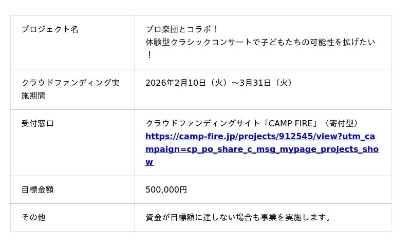 本プロジェクトは開始当初より、当事業団の自主財源により運営してきました。事業運営によって生じた収益は、公益目的の事業として社会に還元しています。しかし、収益は毎年度安定して得られるものではなく、近年は物価や人件費の高騰により、学校単位でのバス送迎の継続も困難となっています。令和6年にはクラウドファンディングに初めて挑戦しましたが、目標達成には至りませんでした。令和8年6月には、対象を名古屋市内の全小学校に拡大し、より多くの子どもたちに文化芸術を届けるため、そして、私たちと一緒に子どもたちの可能性を広げるきっかけをつくる仲間と出会うため、クラウドファンディングに再挑戦します。