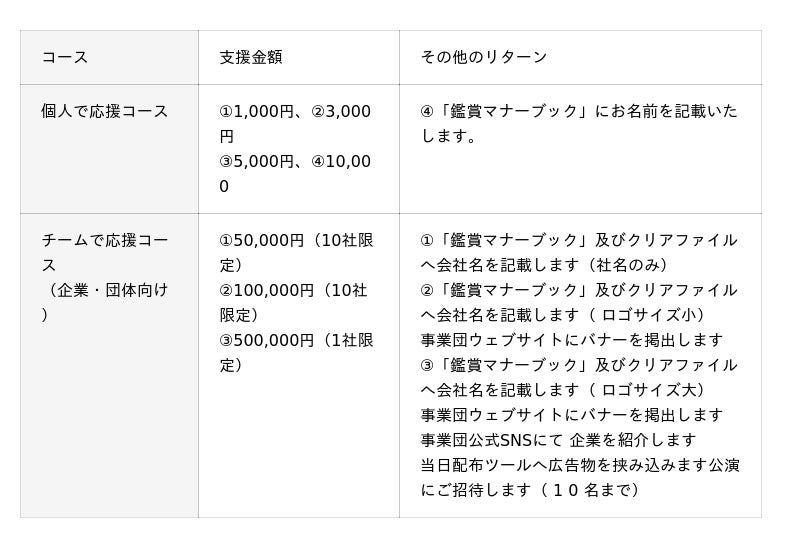 個人および企業・団体の皆さまからのご支援を募るため、それぞれ応援コースをご用意いたしました。本プロジェクトは「寄付型クラウドファンディング」のため購入型クラウドファンディングと異なり、物品やサービスのような「返礼品」はございません。