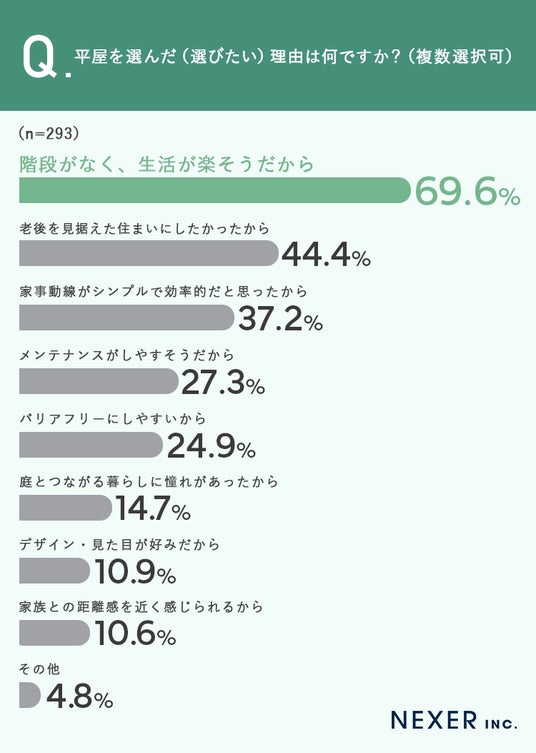 もっとも多かったのは「階段がなく、生活が楽そうだから」で69.6%でした。次いで「老後を見据えた住まいにしたかったから」が44.4%、「家事動線がシンプルで効率的だと思ったから」が37.2%と続きました。