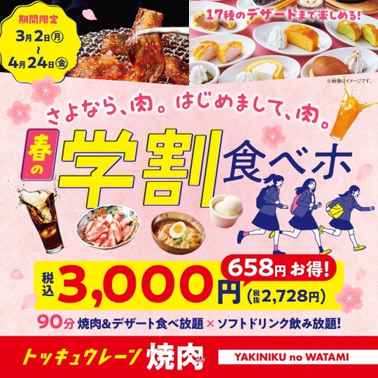 ワタミ株式会社(本社:東京都大田区、以下ワタミ)が全国で展開する、高品質な焼肉をリーズナブルな価格で提供する「焼肉の和民」は、2026年3月2日(月)から4月24日(金)の期間限定で卒業・入学の時期に合わせた、90分焼肉食べ放題×ソフトドリンク飲み放題の「学割食べホ」プランに17種のデザートの食べ放題も追加した、「春の学割食べホ」プランを税込3,000円で販売します。