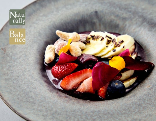 いちご、ブルーベリー、フランボワーズ、バナナなどのフルーツにアサイーピューレ、オーガニックナッツを合わせた栄養たっぷりのアサイーボウル。