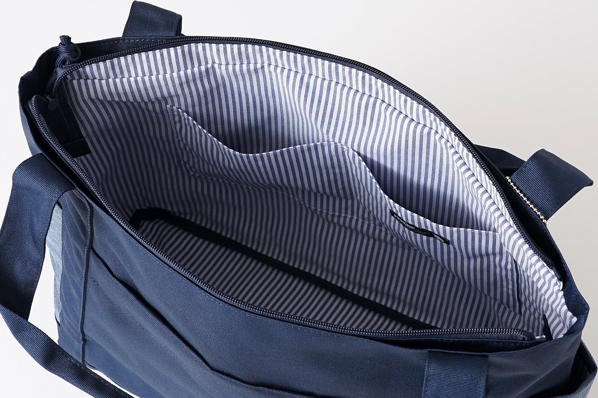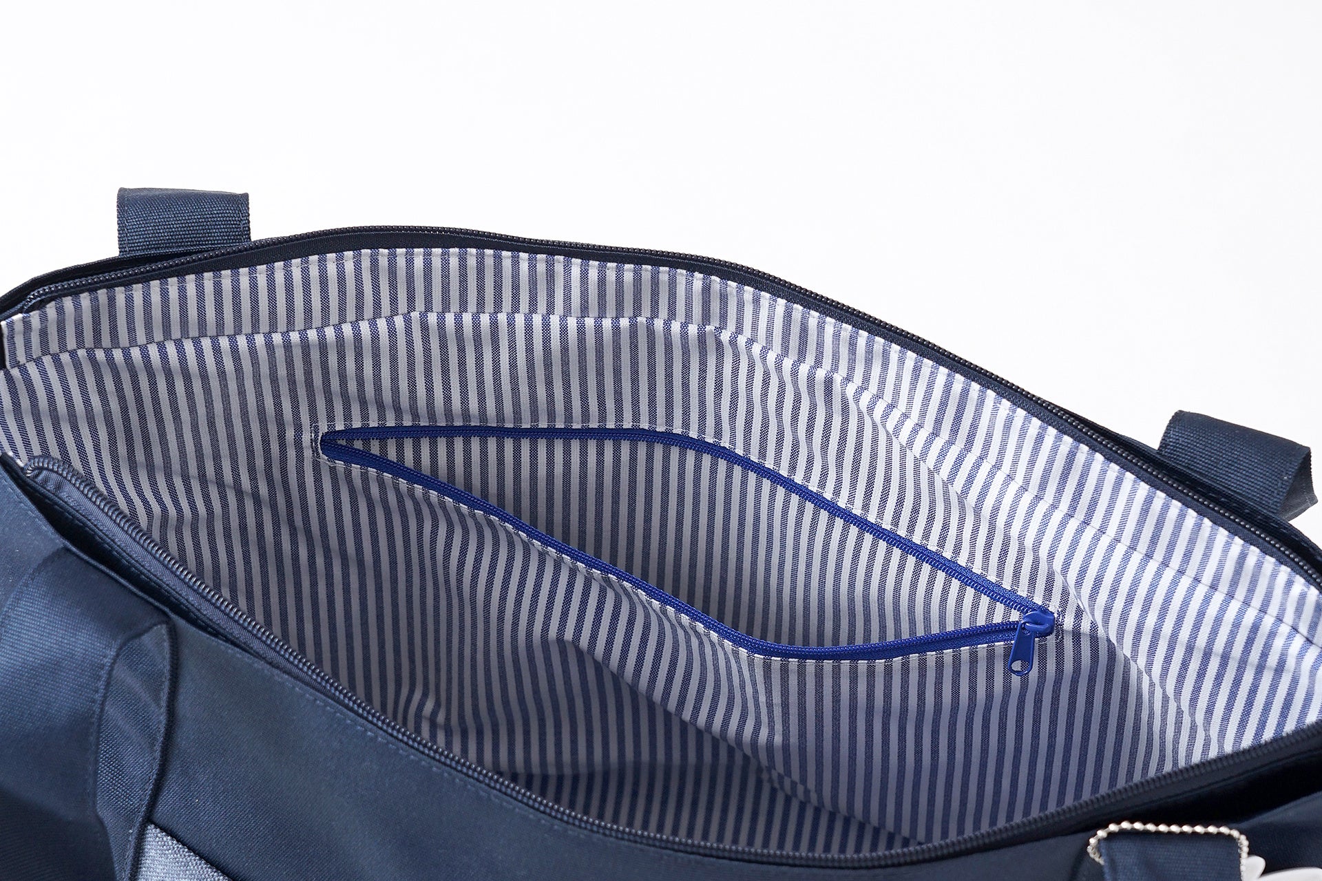 バッグ内部には、仕分けに便利なファスナーポケットとオープンポケットを完備。小物が迷子にならず、快適に整理が行えます。 さらに、内生地には爽やかなブルーのストライプ柄を採用。心が弾む可愛らしさだけでなく、中を明るく照らすことで、奥にある荷物が見つけやすいという実用性も備えています。