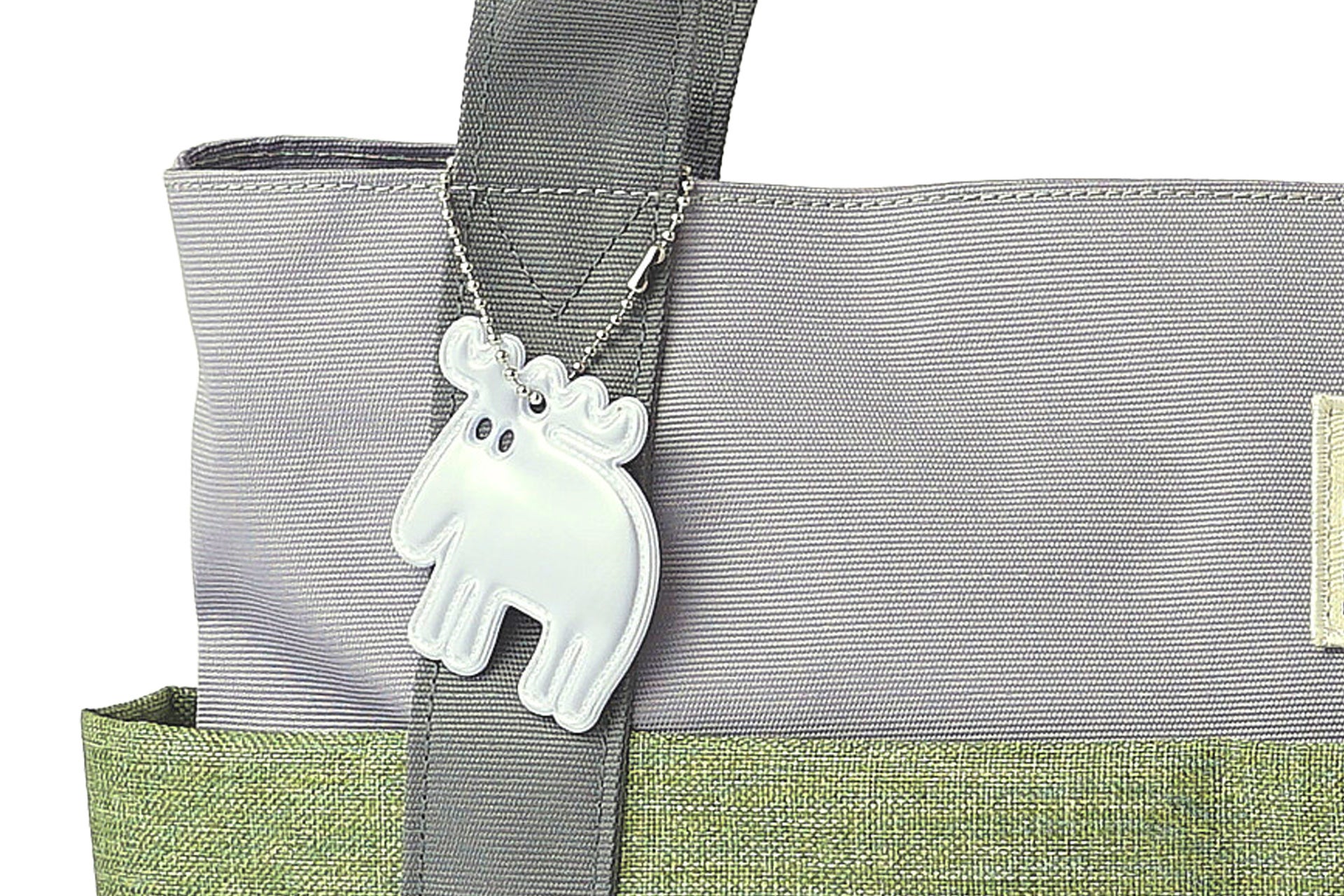 バッグのサイドには、mozのアイコンである「エルク」を象ったリフレクトチャームが付属しています。光を反射する素材を使用しているため、デザインのアクセントとしてはもちろん、夜間の歩行や自転車移動の際の視認性を高めてくれる