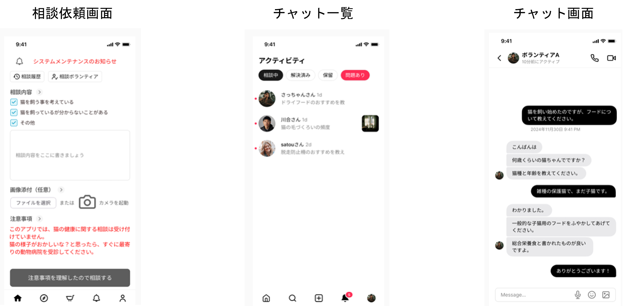 ・非対面相談:やりとりはすべてアプリ内のチャットで完結。文章だけでなく写真や動画を使った相談も可能です。