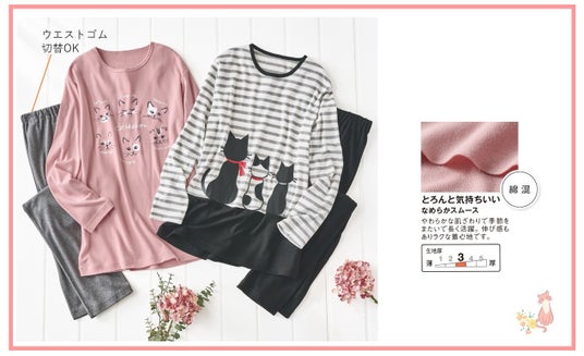 左『ねこプリントが可愛い!Tタイプパジャマ』(カラー:スモークピンク)