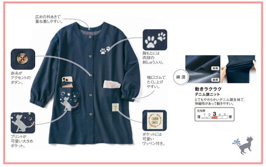 シンプルなデザインで機能性にもこだわった割烹着です。かわいらしい ねこのシルエットプリントや肉球の刺繍をあしらい、家事の時間も楽しく過ごせるデザインに仕上げました。さらに、使い勝手にもこだわり、便利な3つのポケット付き・袖口はゴム仕様で作業がしやすく、重ね着しやすいゆとりのあるサイズ感で、毎日の家事を快適にサポートします。