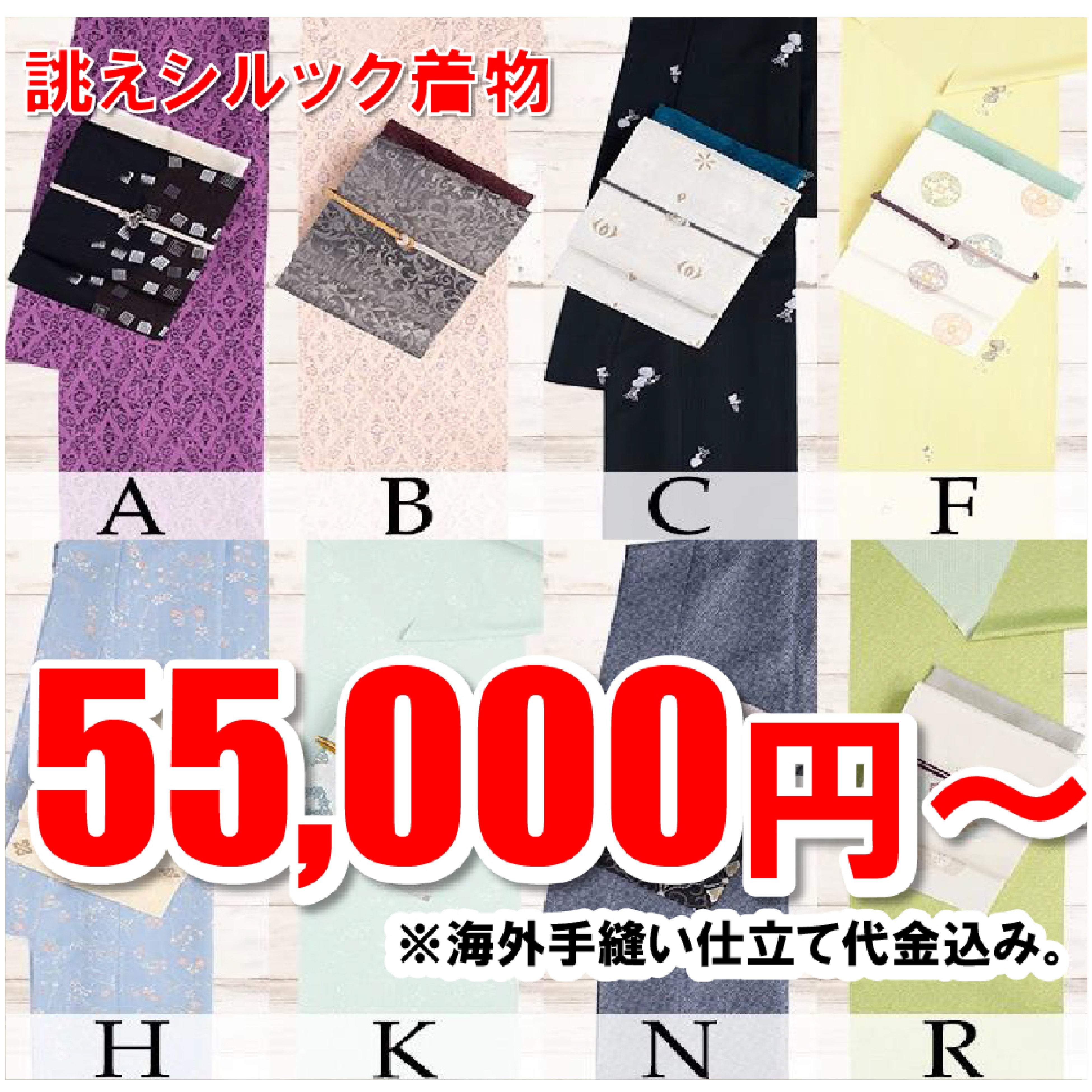 ・誂えシルック着物:55,000円~ ※海外手縫い仕立て代金込。