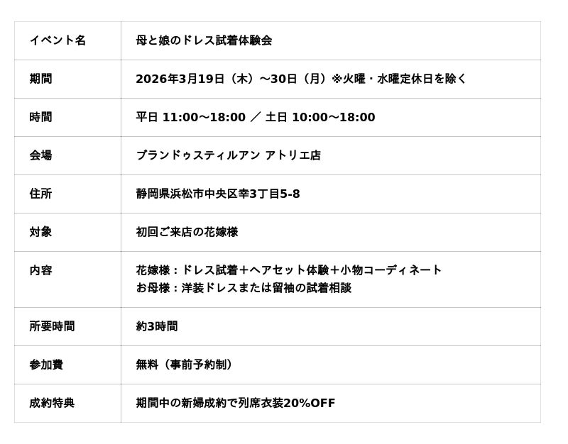 静岡県浜松市でブライダル事業を展開する株式会社スティルアン(本社:静岡県浜松市中央区田町326-30、代表取締役社長:大石 奉樹)は、2026年3月19日(木)~30日(月)の期間(定休日を除く)、初回ご来店の花嫁様を対象に、母と娘で一緒にドレスを試着できる特別イベント「母と娘のドレス試着体験会」をブランドゥスティルアン アトリエ店にて開催いたします。