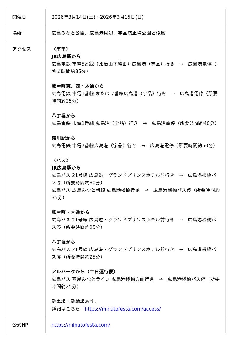 広島みなとフェスタとは、毎年3月に、広島みなと公園及び広島港周辺・似島にて開催されるイベントです。広島3大フェスタとも言われており、来場者は2日間で8万人近く。有名アーティストやゲストが多数登壇するステージ企画のほか、お仕事や遊び・学びの体験ブース、船や海上でのイベント、グルメブースにお買い物など見どころ満載。