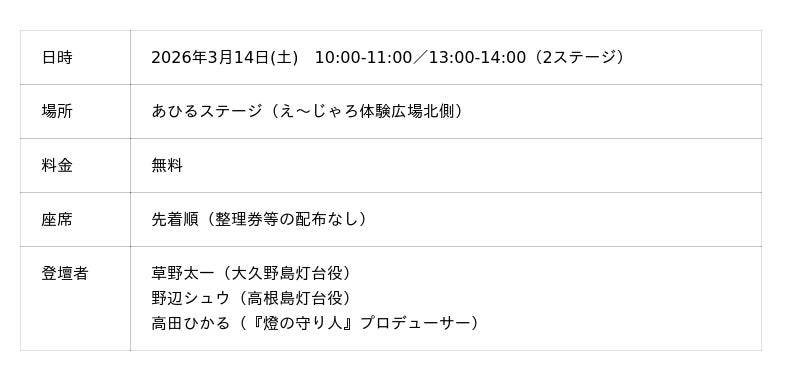 『燈の守り人』からは、広島県に建つ灯台の守り人を演じる声優2名が登壇します。竹原市の大久野島灯台を演じる草野太一さん、尾道市の高根島灯台を演じる野辺シュウさん(いずれも青二プロダクション所属)が、クイズや朗読を交えつつ、地元の灯台の魅力をお届けします。