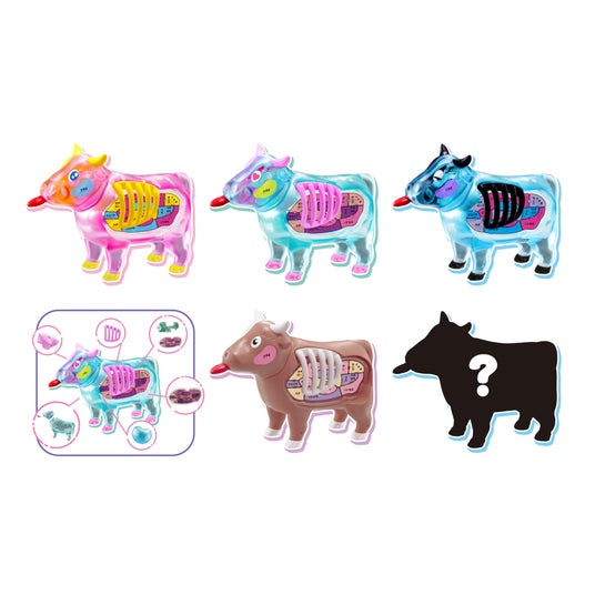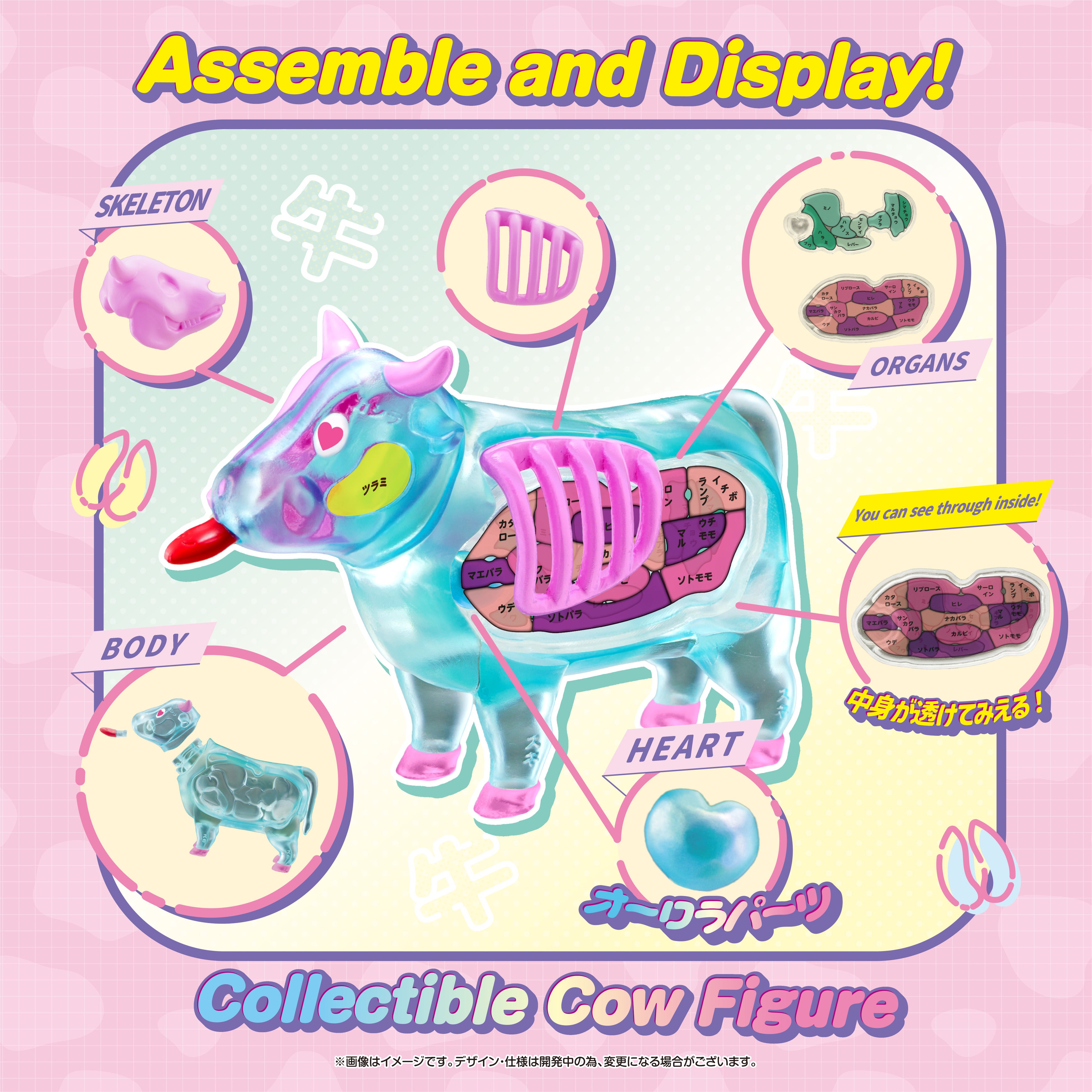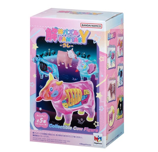 その節目を祝う記念アイテム『解体パズル FANTASY ーうしー』は、色やデザインの異なる、カラフルで個性豊かな5種類の“うし”をラインアップしたコレクションフィギュアです。ピンク、ブルー、ブラウン、グリーンに加え、シークレットを含む全5種で展開し、ファンタジックな色合いと透明感のあるボディが特長です。パーツを組み立てたり分解したりして遊べるほか、そのまま飾っても楽しめます。本体は全長約90mmの手のひらサイズ。内臓パーツは2層構造になっており、細かなパーツも可愛らしくデフォルメされています。特に HEART パーツにはオーロラ塗装が施され、透明ボディ越しに見える美しさも魅力です。また、中身が分からないランダム仕様のため、複数集めることでパーツの組み替えが可能になり、オリジナルの“うし”にアレンジする楽しさが広がります。インテリアとして飾りやすく、コレクションしやすいサイズ感で、10周年を彩る華やかな記念アイテムとなっています。