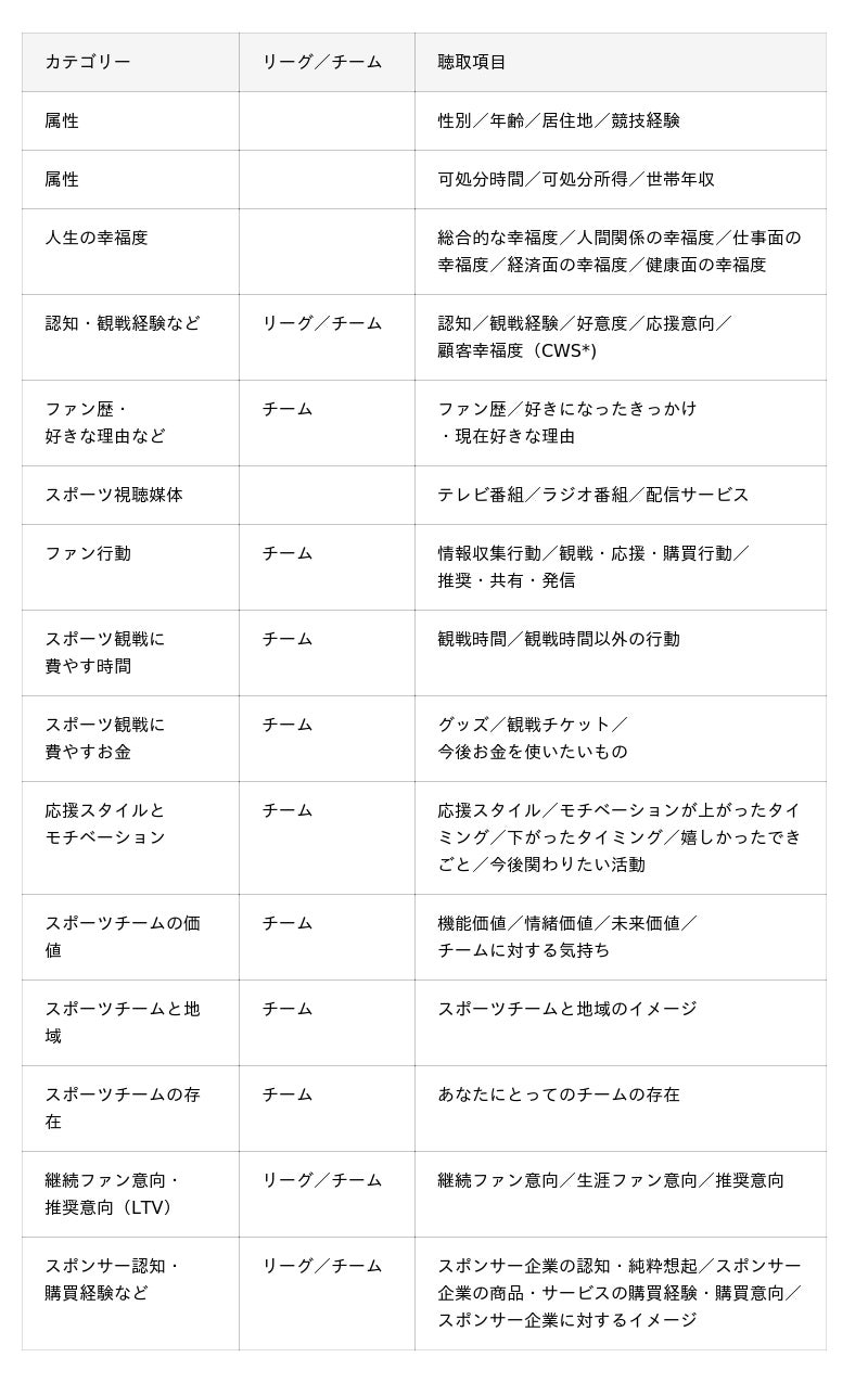 今回の調査では、日本プロ野球(12チーム)、Jリーグ(J1:20チーム)、リーグワン(ディビジョン1:12チーム)の計44チームのファンを中心に、それぞれのリーグ・チームについて以下の項目を聴取しました。【調査項目】