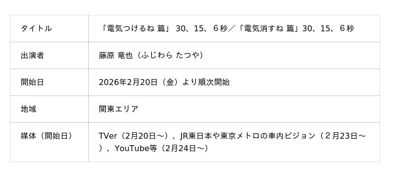 東京ガス株式会社(社長:笹山 晋一、以下「東京ガス」)は、俳優の藤原竜也さんを起用した新作CM「電気つけるね篇」、「電気消すね篇」の全2篇(以下「本CM」)を、春の電気契約キャンペーンに合わせて、本日(2月20日)から公開します。