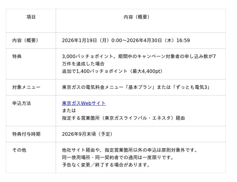 本キャンペーンは、引越しシーズンにあわせて、電気の新規契約や切り替えを検討するお客さまに向けて実施するもので、対象条件を満たしたお客さまにポイントを進呈します。
