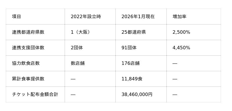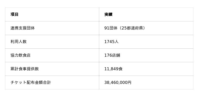 2022年3月、「子どもたちを見守る大人をバックアップしたい」という想いから有志で立ち上げた小さな団体が、今や25都道府県91支援団体、176店舗の協力飲食店とのネットワークを築き、累計11,849食の温かい食事を全国の子どもたちに届け、チケット配布金額は累計38,460,000円に達しました。