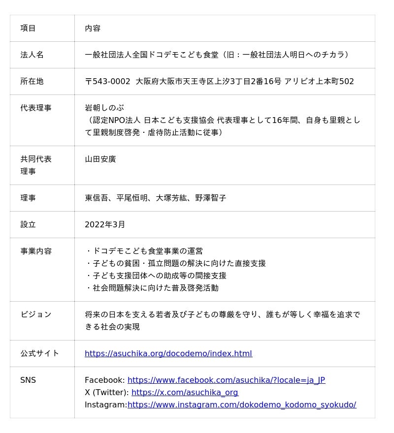 一般社団法人明日へのチカラ(所在地:大阪市天王寺区、代表理事:岩朝しのぶ)は、本日2026年2月25日で、「一般社団法人全国ドコデモこども食堂」へ社名を変更いたしますので、お知らせいたします。