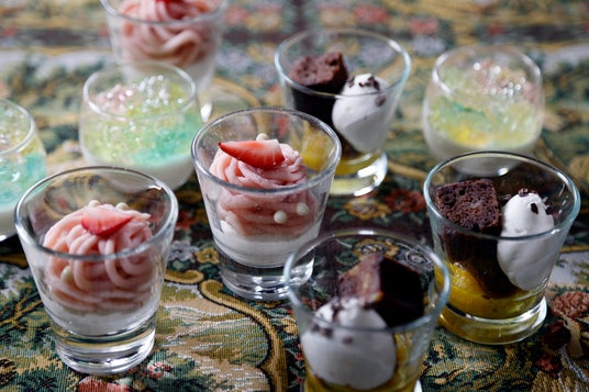 グラスデザート 3種(桜香るモンブラン / パンナコッタとクリスタルジュレ / ケークショコラとオレンジコンフィチュール)/ クレーム・ブリュレ / キャラメルバナナブラウニー / フィナンシェとコンディメンツ(ワゴンスイーツ)/ ジェラート 10種 / ポップコーン