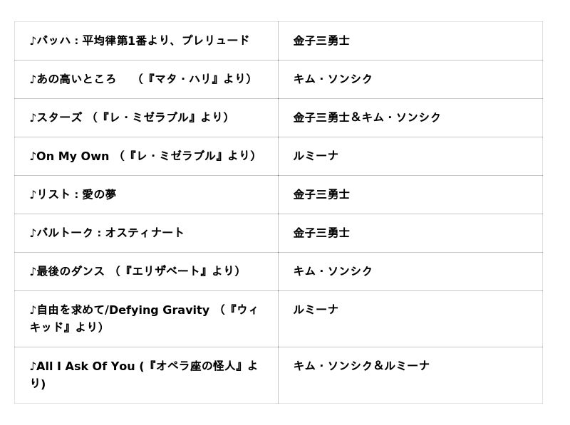 開催および出演者の発表に際し、「一体、どんな公演なのか!?」と注目を集めている本公演。曲目は、バッハ、リストの「愛の夢」、『レ・ミゼラブル』の名曲シリーズ、『エリザベート』より「最後のダンス」、大ヒットしたミュージカル映画『ウィキッド』の主題歌としてもなじみ深い「自由を求めて/Defying Gravity」、そして『オペラ座の怪人』より「All I Ask Of You」ほか、名曲がずらりと並ぶ豪華なラインナップとなっています。
