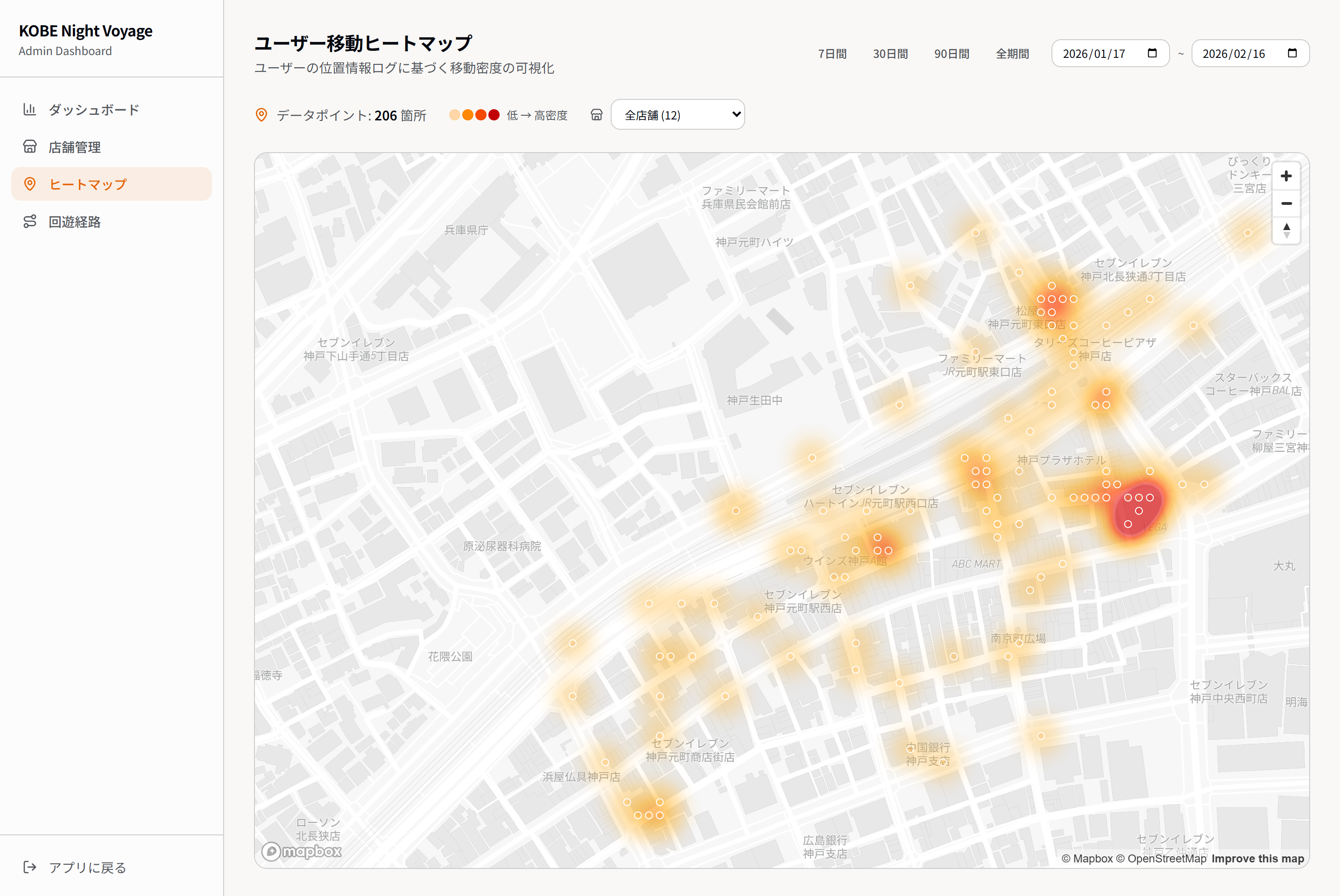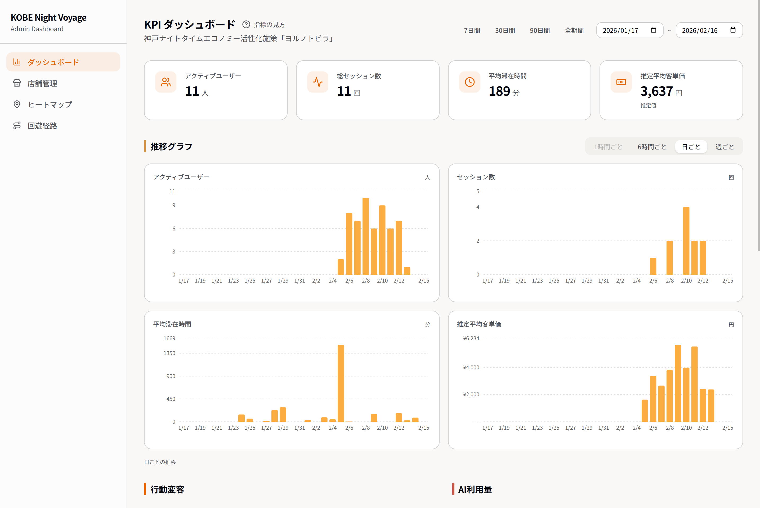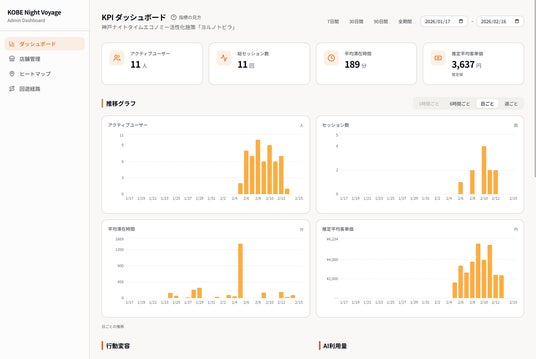本サービスでは、ユーザーの回遊傾向、AIとの対話内容、時間帯ごとの行動選択といった体験ログを、個人を特定できない形で匿名化・構造化し、継続的に蓄積しています。これらのデータは専用ダッシュボード上でリアルタイムに可視化され、都市空間における体験の生成プロセスを分析可能な状態で管理されています。
