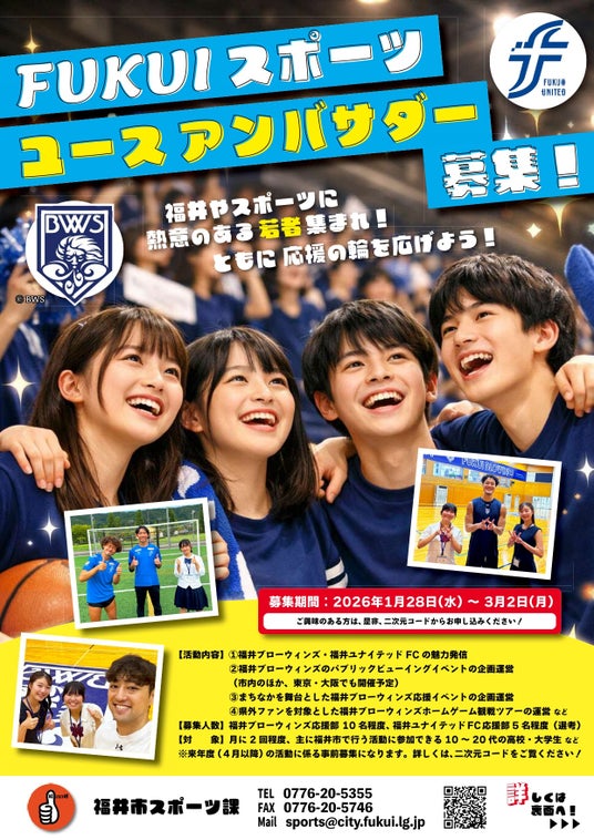 福井市では、福井のトップスポーツチーム「福井ブローウィンズ」「福井ユナイテッドFC」の魅力発信や観戦交流企画などに取り組む、地元スポーツチーム応援コミュニティ「FUKUIスポーツユースアンバサダー」を募集しています!