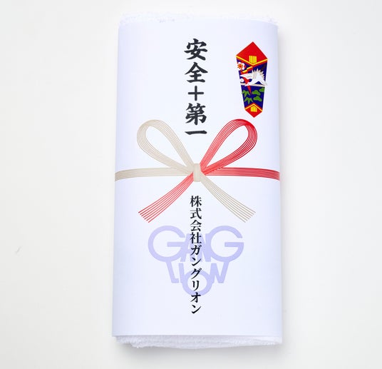 株式会社ガングリオンの会社挨拶用の「安全第一」タオルです。社名入りで、日常使いはもちろん、友人や同僚、上司へのプレゼントにもおすすめです。