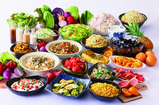 新鮮野菜や惣菜サラダ、フルーツやデザートなど20種類以上が食べ放題の新鮮サラダバーは、産地と鮮度にこだわって仕入れた野菜や果物を使用しています。店内カット、調理をすることで新鮮さと美味しさを保ち、なおかつ栄養も満点です。