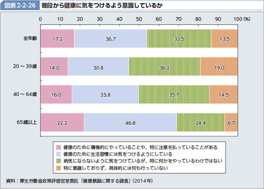厚生労働省の調査でも、健康に気をつけたいと考えている人は多数派である一方、特に何も行動に移せていない人は約3割にのぼることが示されています。また、運動習慣がある人も全体の約3割程度にとどまっています。