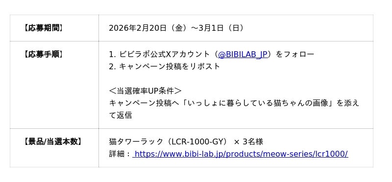 弊社趣味グッズブランド「BIBILAB(R)(ビビラボ)」の猫と人が一緒に使える家具シリーズ【ビビにゃお】は、来る2月22日の『猫の日』を記念し、計3名様に猫家具が当たるSNSプレゼントキャンペーンを開催いたします。併せて、同シリーズ待望の第二弾となる新製品の初出し情報を先行公開し、今後の展開に向けた「猫モニター」の募集を開始することをお知らせいたします。