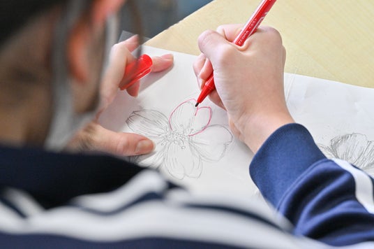 大船渡の小学生が桜の下絵を描く様子