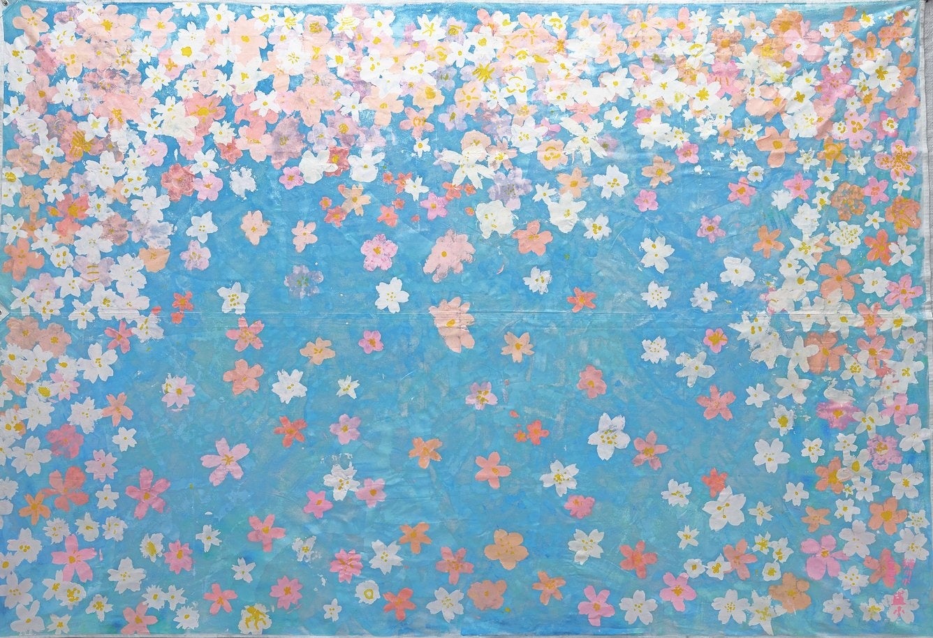 12年目となる2025年は、松坂屋上野店のリクエストで「さくら」をモチーフに旗を制作。岩手県大船渡市立盛小学校、猪川小学校と東京都台東区立谷中小学校の約半年をかけた共同作業により、縦2m、横3mの「むすびの旗」が2枚完成しました。