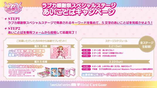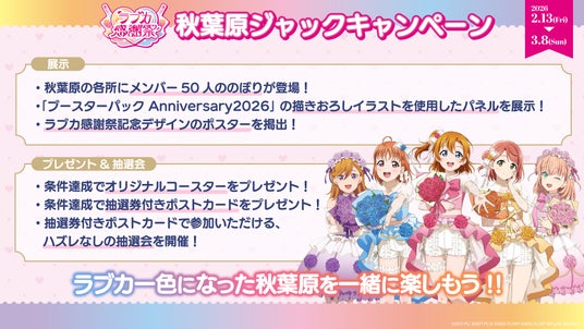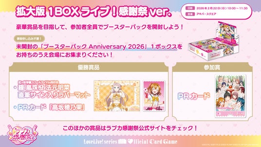 また、キャスト登壇ステージでは当日先行販売される「ブースターパック Anniversary 2026」の開封ビンゴに挑戦するコーナー、「ラブカでビンゴ!!」を実施いたします!
