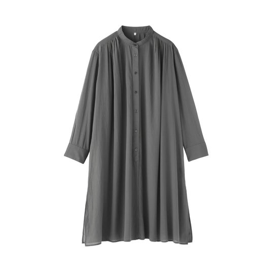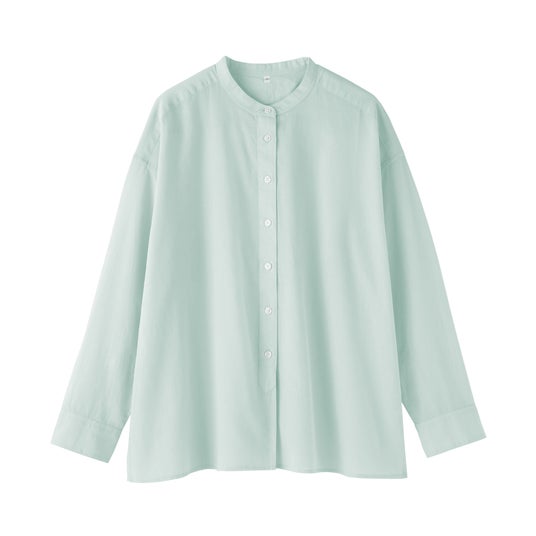 透け感のある素材で仕立て、軽やかな着心地が特長のスタンドカラーの長袖シャツです。全体的にゆったりしたシルエットなので、肌寒い時期には中に重ね着もできます。程よい透け感が楽しめるオフ白ストライプ、やわらかい印象のライトブルーやコーデが締まる濃色を揃えました。
