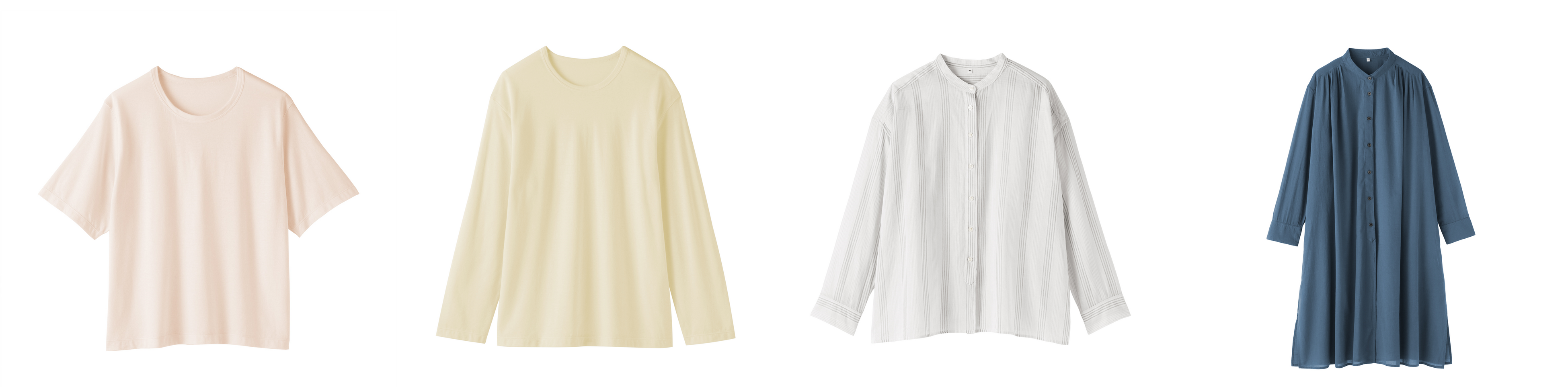 強撚糸※1を使用し、やわらかな肌ざわりが特長です。しっかりと撚りをかけた糸ならではのと、綿のやわらかな風合いが両立しており、春先から初夏頃まで心地よく着用していただけます。また、上品な透け感があるため、合わせるインナーによって印象が変わり、スタイリングの幅が広がります。軽やかな素材感で、春先のレイヤードスタイルから夏の涼しげな着こなしまで、長い季節にわたって活躍するシリーズです。綿はオーガニックコットン100%です。