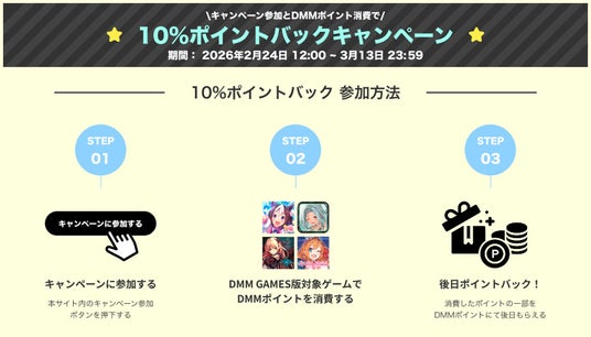 合同会社EXNOA( 本社:東京都港区、CEO:東條 寛、URL:https://games.dmm.com/ )が運営するDMM GAMESは、2月24日(火)より、対象タイトルのプレイで最大10,000円分のDMMポイントが抽選で当たるプレイミッションキャンペーンをはじめとした「春のCygames合同キャンペーン2026 Powered by DMM GAMES」を開催することをお知らせいたします。