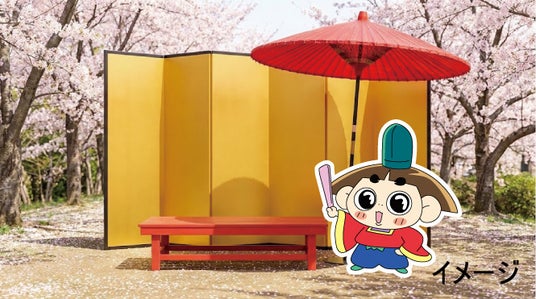 エンゼルランドの桜の下で、おじゃる丸と一緒にお花見気分で記念撮影をしよう。※実施日時は桜の開花や天候によりホームページでお知らせします