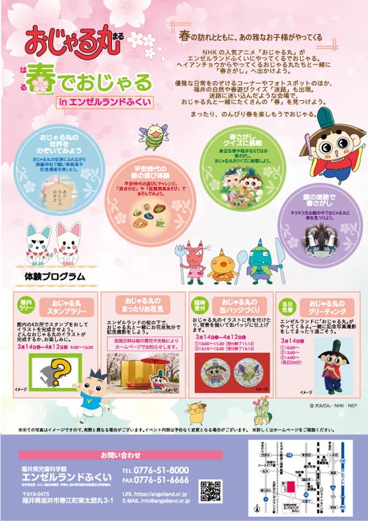 NHKの人気アニメ「おじゃる丸」がエンゼルランドふくいにやってくるでおじゃる。ヘイアンチョウからやってくるおじゃる丸たちと一緒に「春さがし」へ出かけよう。