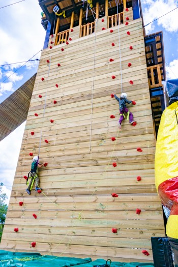 垂直な壁で、クライミングできる「カベダス」。5階建ての「トビダス・タワー」を、一気に登っていきます。