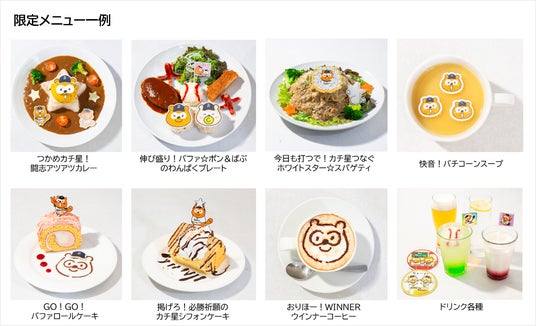 「バファローズ☆ポンタ カチ星カフェ ~バファ☆ポン Loves Again!~」では、会場だけで味わえる限定メニューやカフェ開催記念グッズを販売します。限定メニューとして、バファ☆ポンをモチーフにしたお食事やデザート、ドリンクなどの全11種類を提供します。勝利をイメージした白星のライスにバファローズ☆ポンタの形のパンプキンサラダをのせた「つかめカチ星! 闘志アツアツカレー」や、星形トッピングに勝利を願う気持ちを込めた「今日も打つで!カチ星つなぐホワイトスター☆スパゲティ」などをご用意します。またカフェ開催記念グッズとして、マグカップ、アクリルスタンド、シークレットマグネット、シークレットステッカーを販売します。