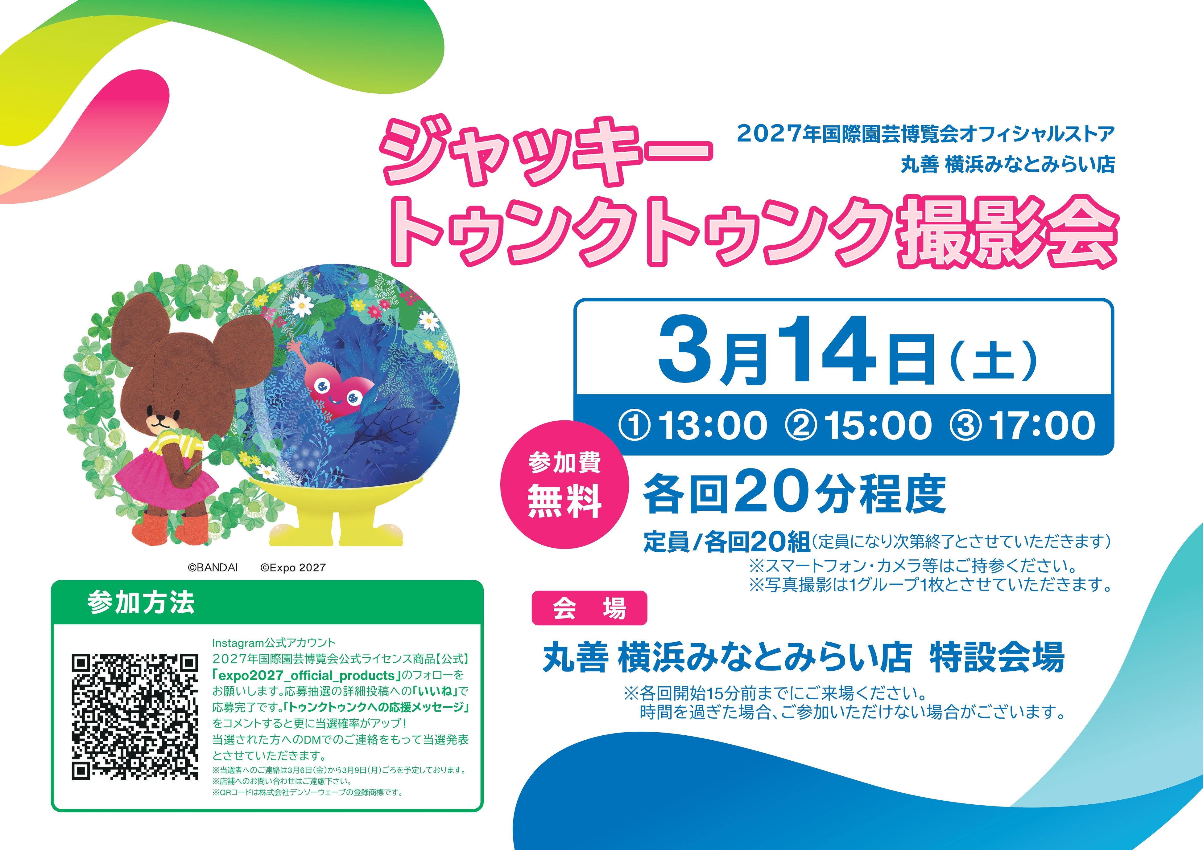 コラボレーション商品の発売を記念して、EXPO 2027 オフィシャルストア 丸善 横浜みなとみらい店に「ジャッキー」と「トゥンクトゥンク」が遊びに来ます!一緒に写真を撮ったり、ふれ合ったりして楽しみましょう。(事前応募抽選制)【イベント概要】